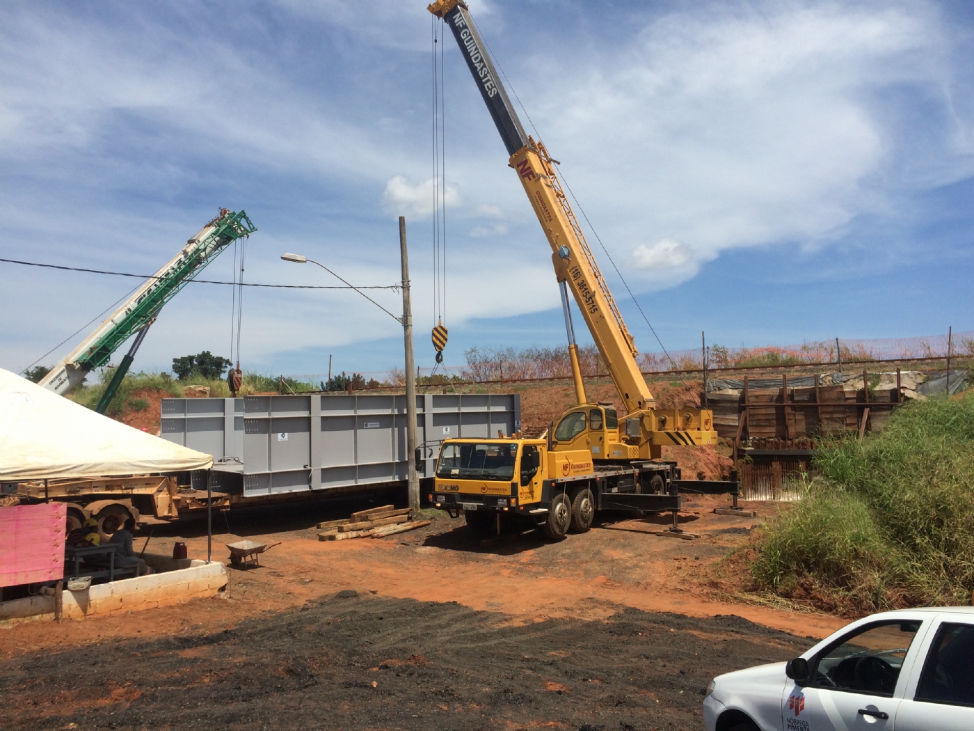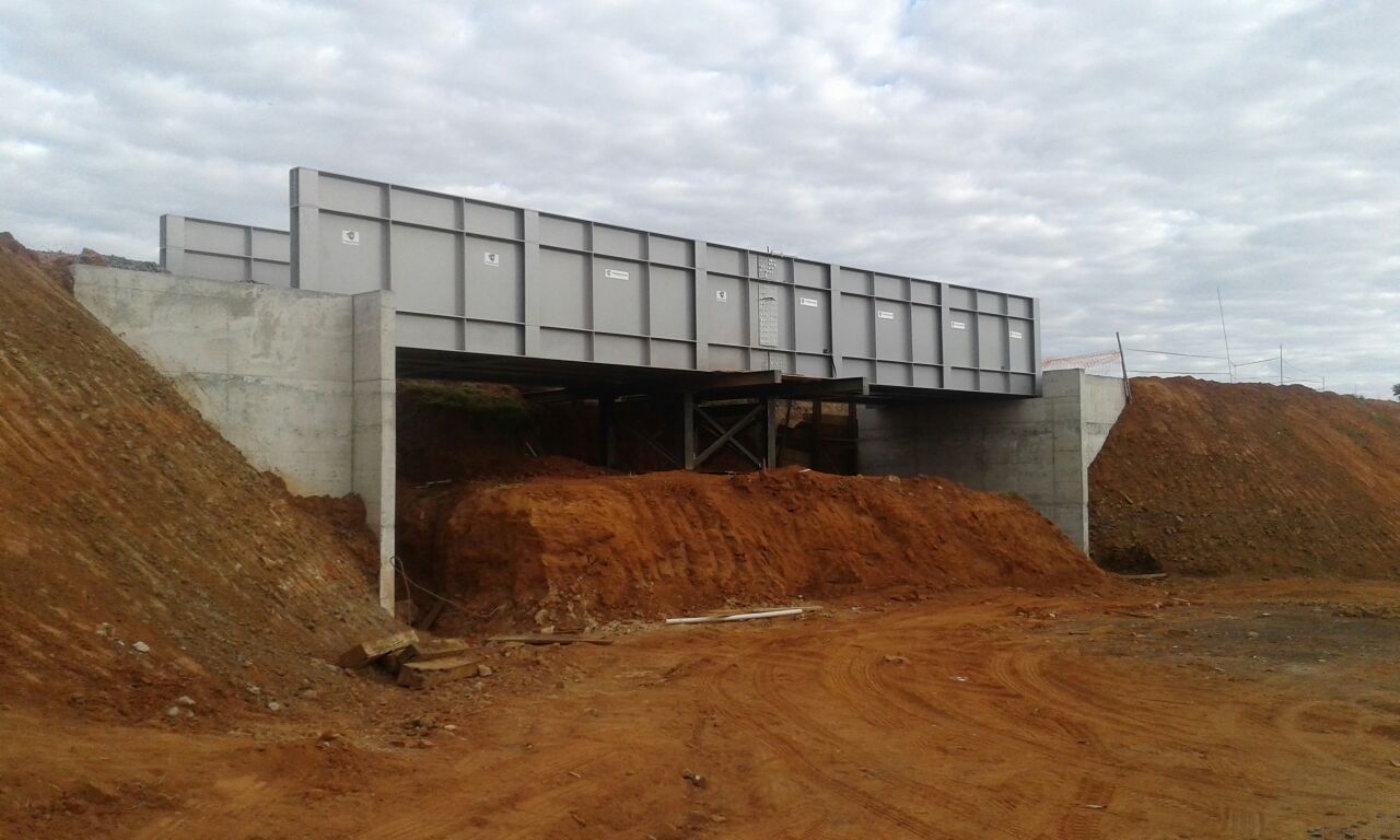 Uma obra desafiadora, que exigiu soluções inovadoras e mobilização de uma equipe técnica especializada e experiente. Foram executados todos os serviços necessários para a construção de estrutura em concreto armado, desde a fundação até a superestrutura. A fundação consistiu na cravação de estacas metálicas, tipo trilho TR-50, sendo utilizados mais de 900 metros de estacas. O tabuleiro, em estrutura metálica, consistiu em dois módulos cujo peso total ultrapassa 60 toneladas, o qual foi apoiado em pilares de concreto armado. Após a conclusão do viaduto, ainda foram executas obras de drenagem, terraplenagem e pavimentação no entorno.
