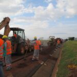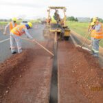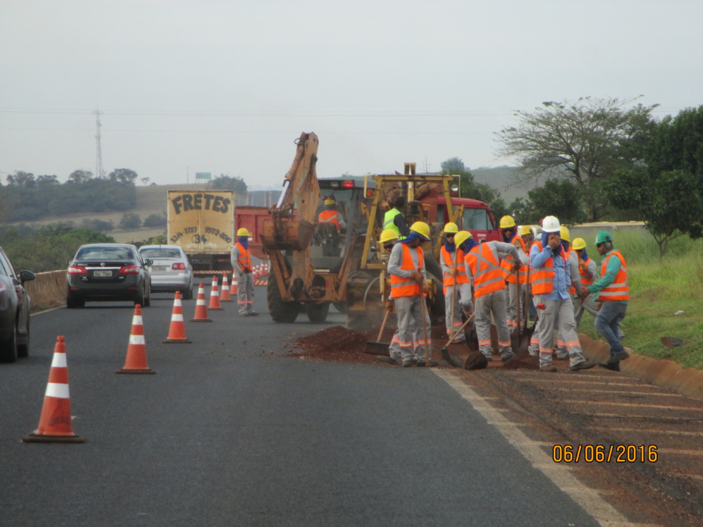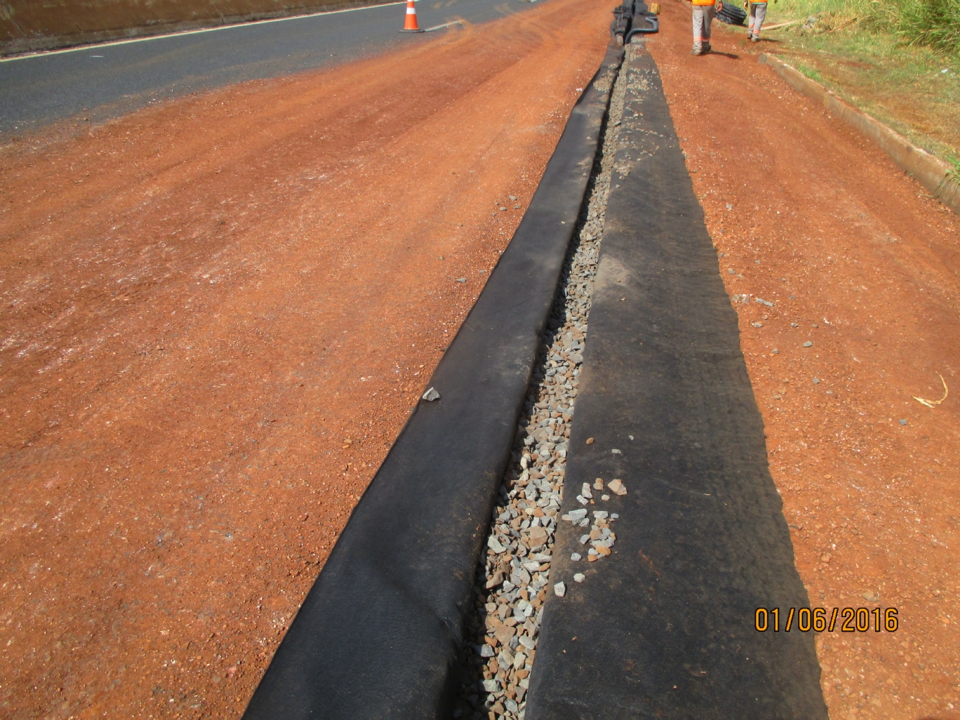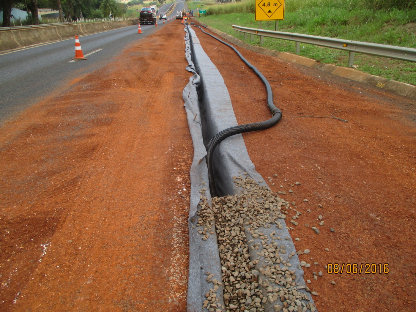 Foram executados drenos profundos no pavimento da BR-050, nos estados de Minas Gerais e Goiás, contemplando a abertura de valas com valetadeira, aplicação de manta geotêxtil e tubo dreno PEAD corrugado, preenchimento com material drenante (brita) e fechamento da vala com CBUQ. No total, foram executados 26 mil metros de drenos no estado de Minas e 11 mil metros no estado de Goiás, entre drenos longitudinais, transversais e mistos.